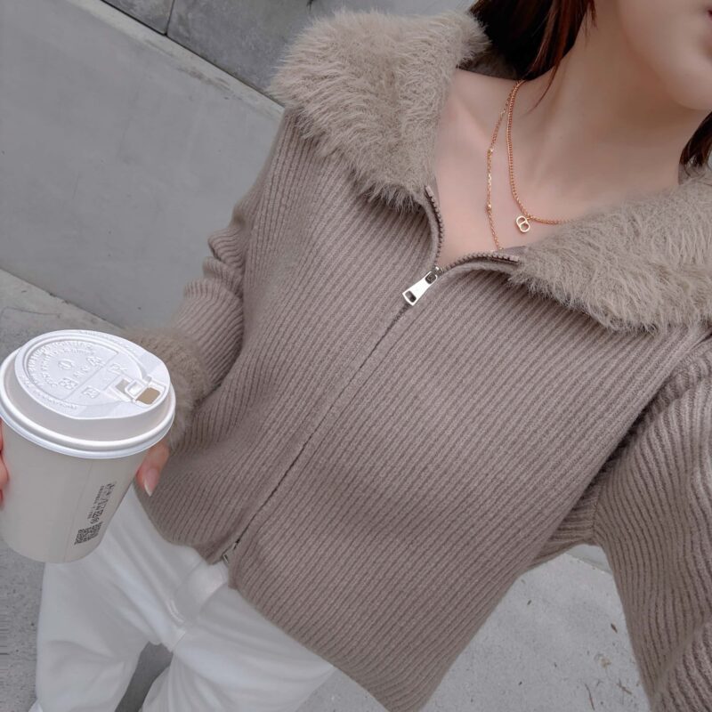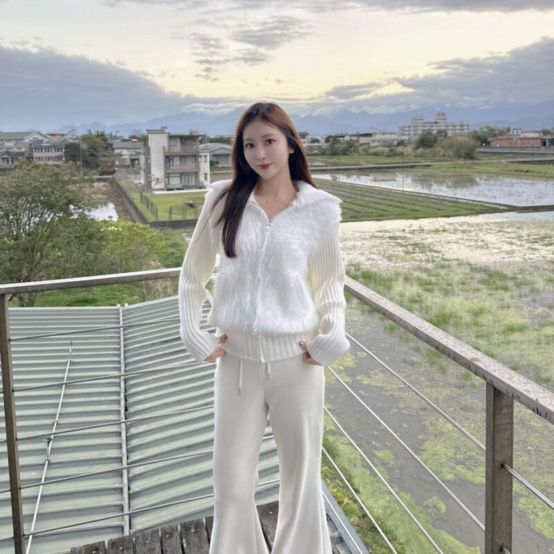 純白治癒精靈-翻領毛毛拼接針織拉鍊上衣