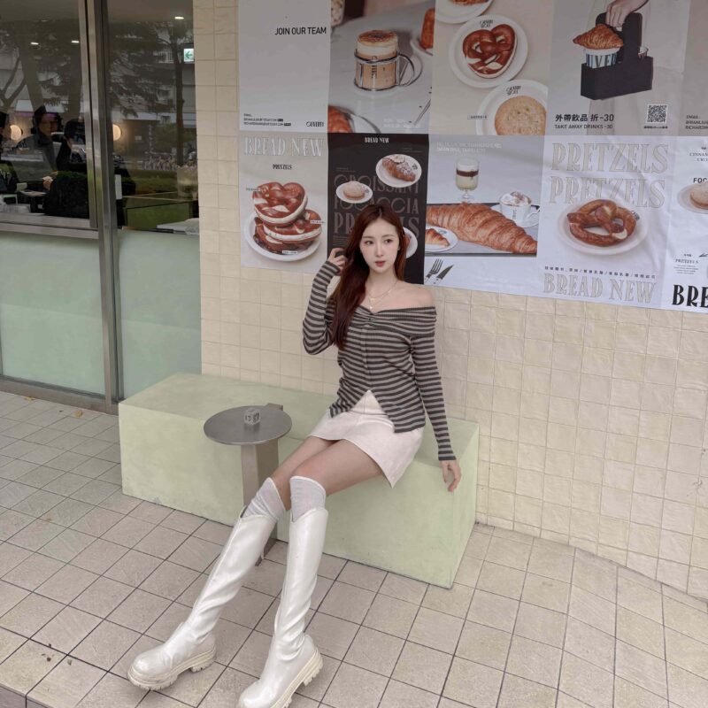 一字領翻領設計 黑白條紋和卡其咖撞色 韓系氣質氛圍 自帶腰身下擺開岔無敵顯瘦 質感坑條面料高彈力超舒適