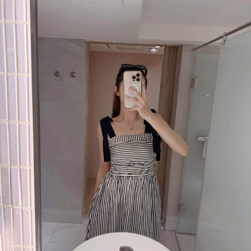 蒙馬特圓舞曲-黑白條紋肩綁帶洋裝