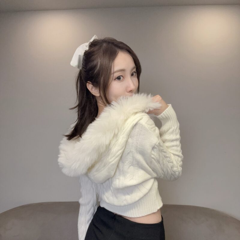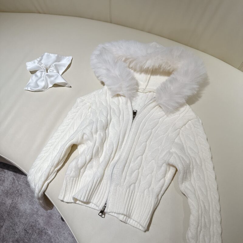 白色戀人-毛毛連帽拉鍊針織毛衣