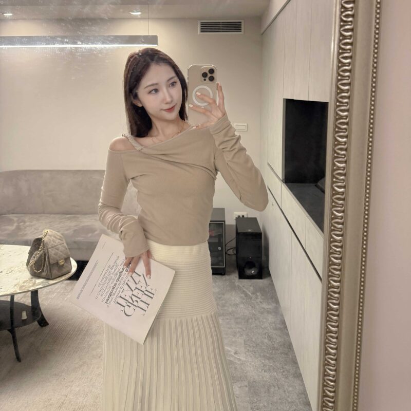 心動依戀-內磨毛斜肩扭結設計感上衣