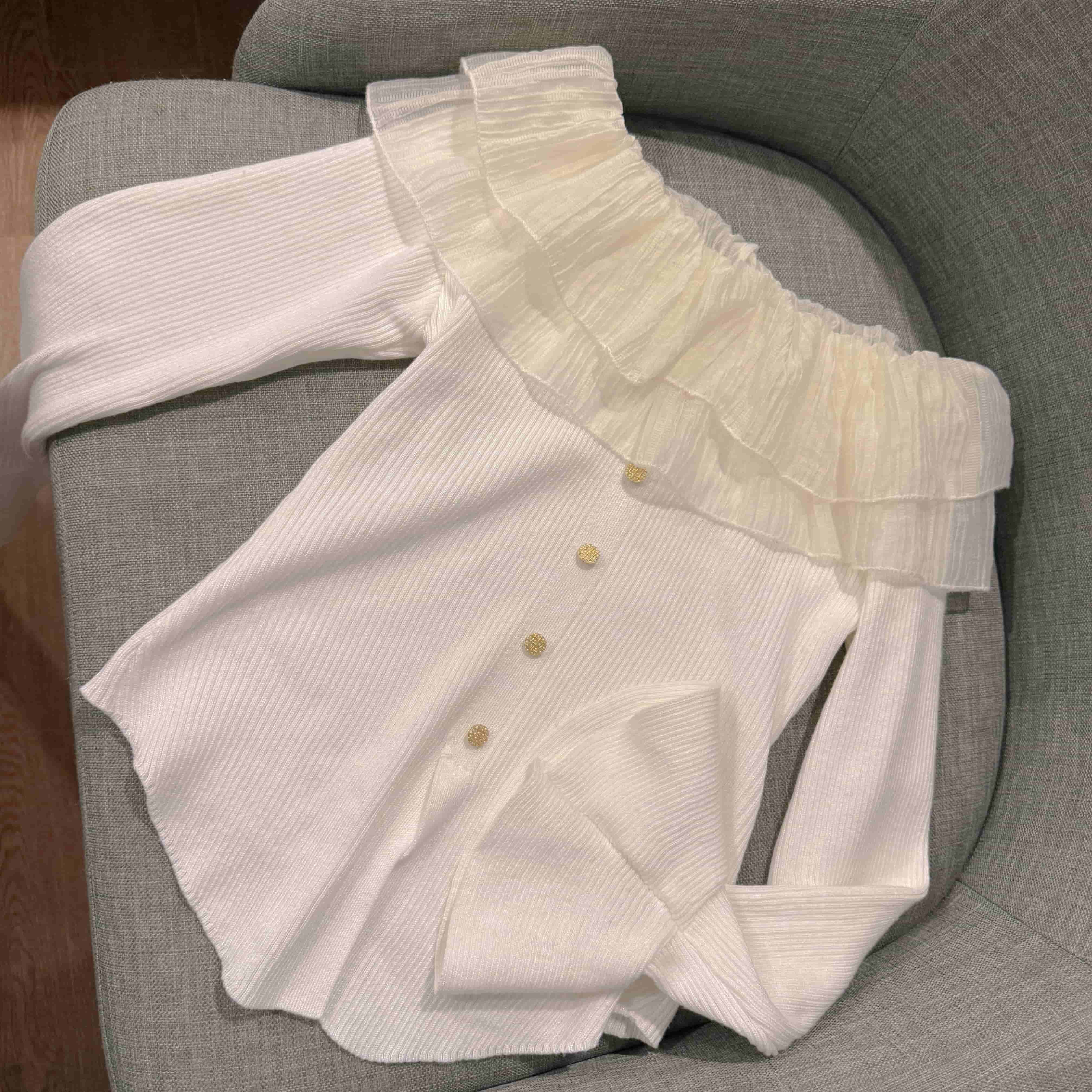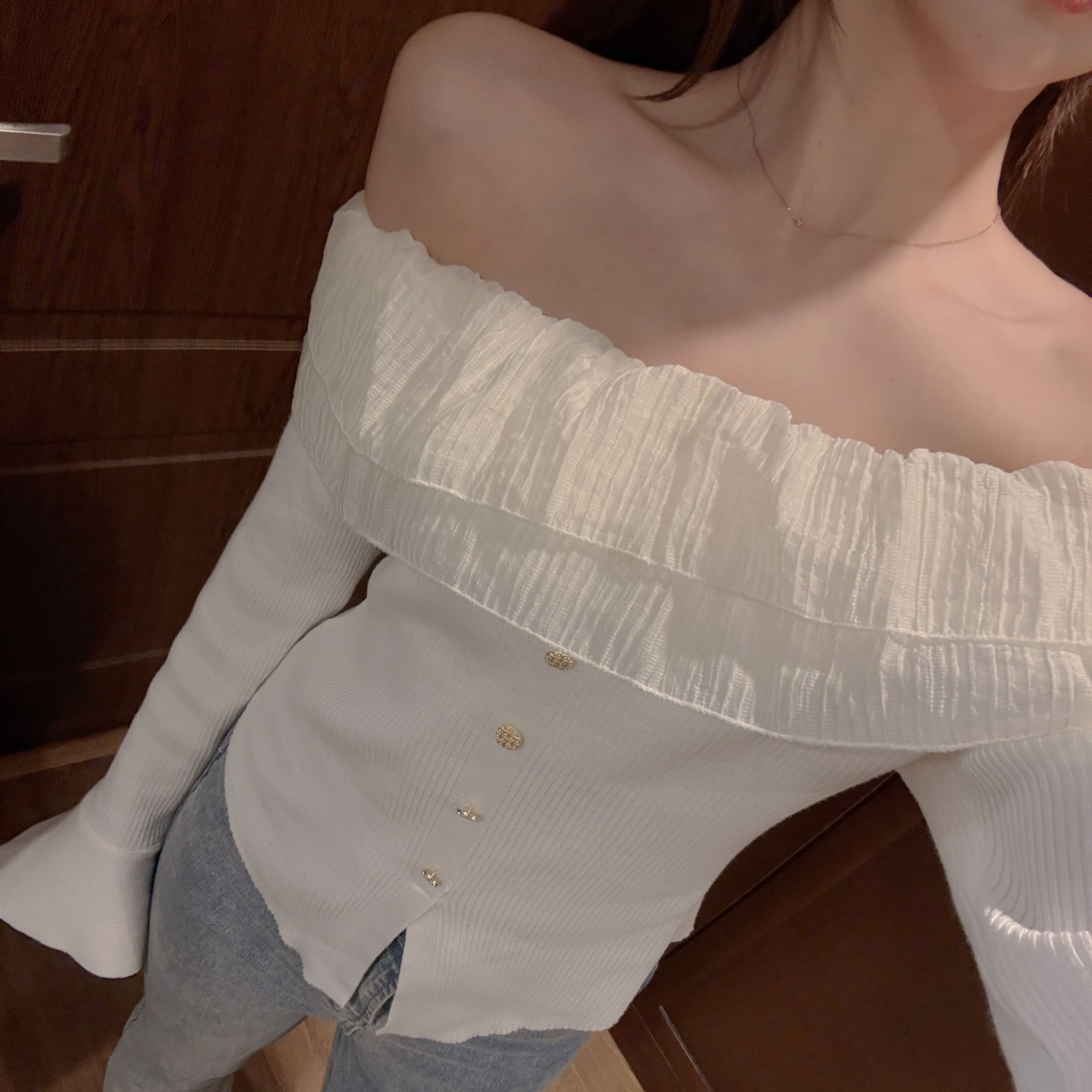 首頁所有商品/All Products上衣/TOP 星幕緞語-一字領荷葉拼接收腰上衣
