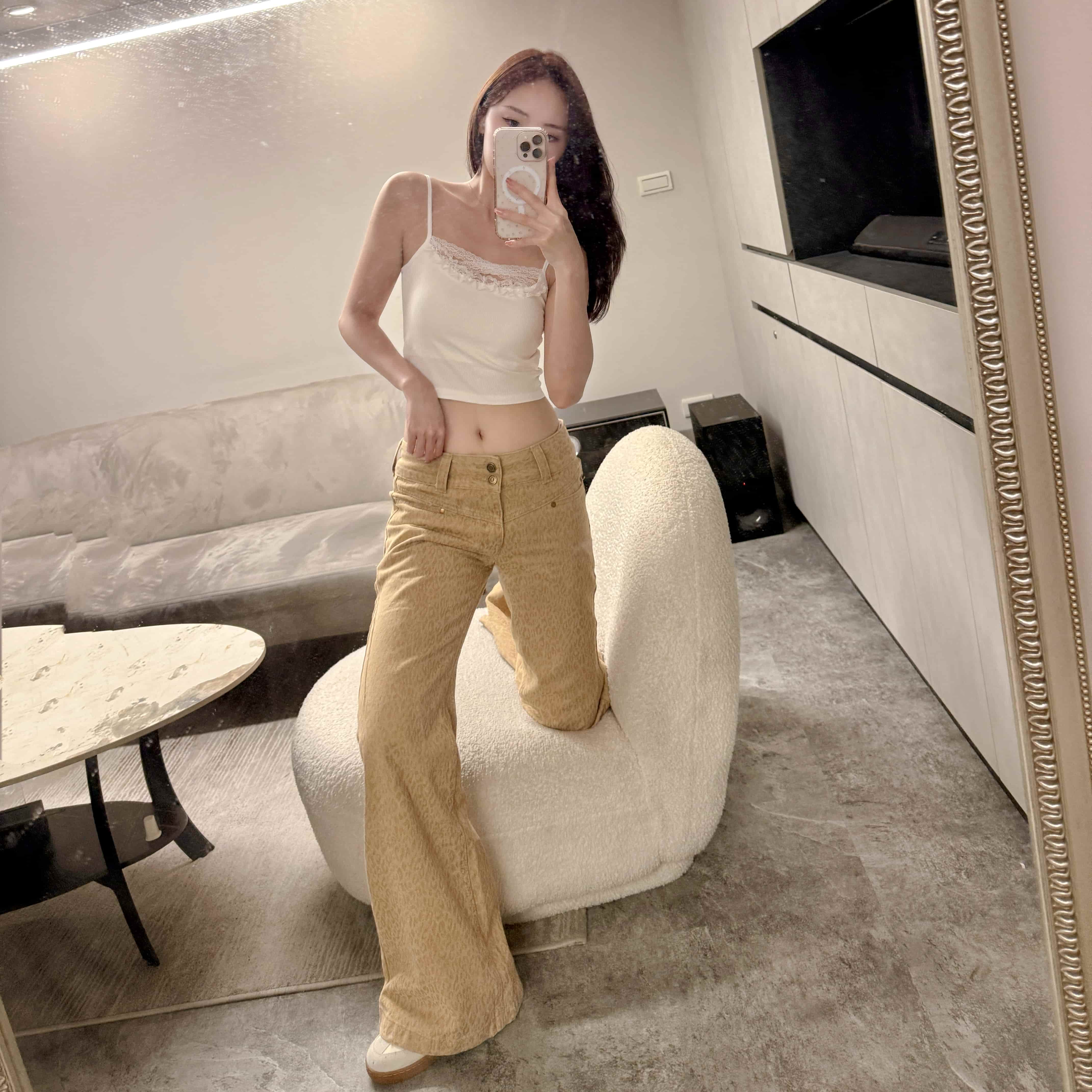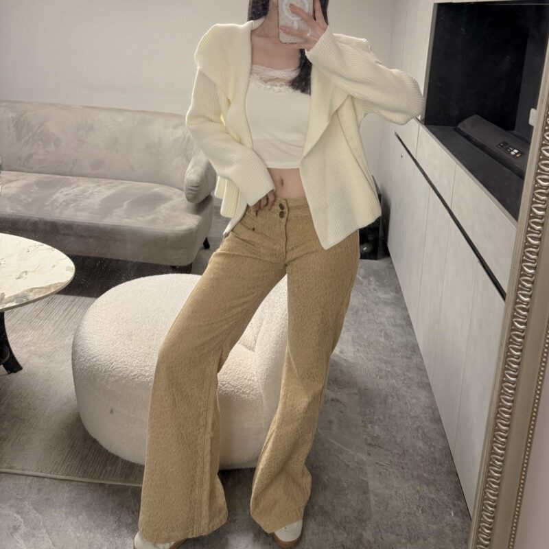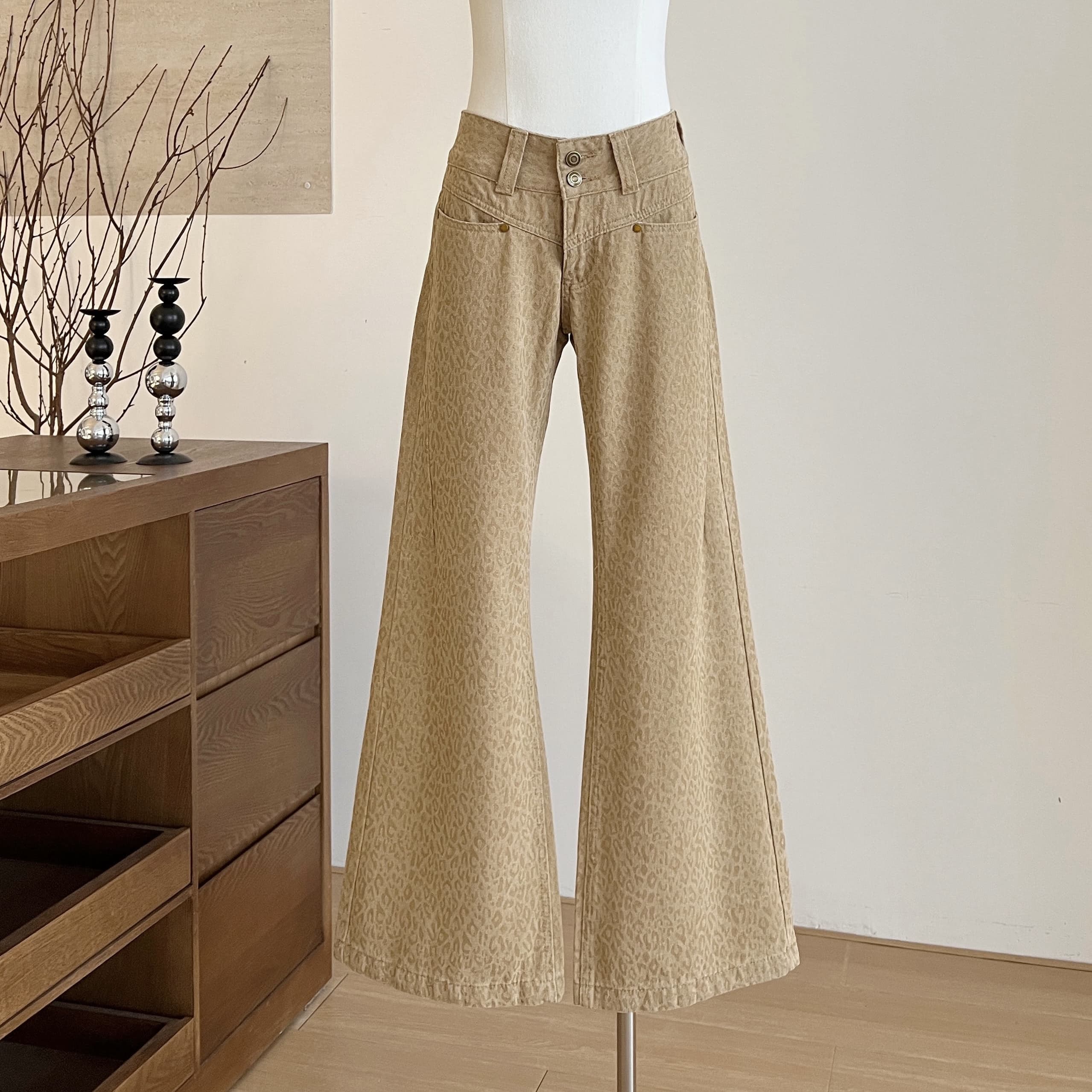 時髦精低腰豹紋淺卡其微喇叭褲