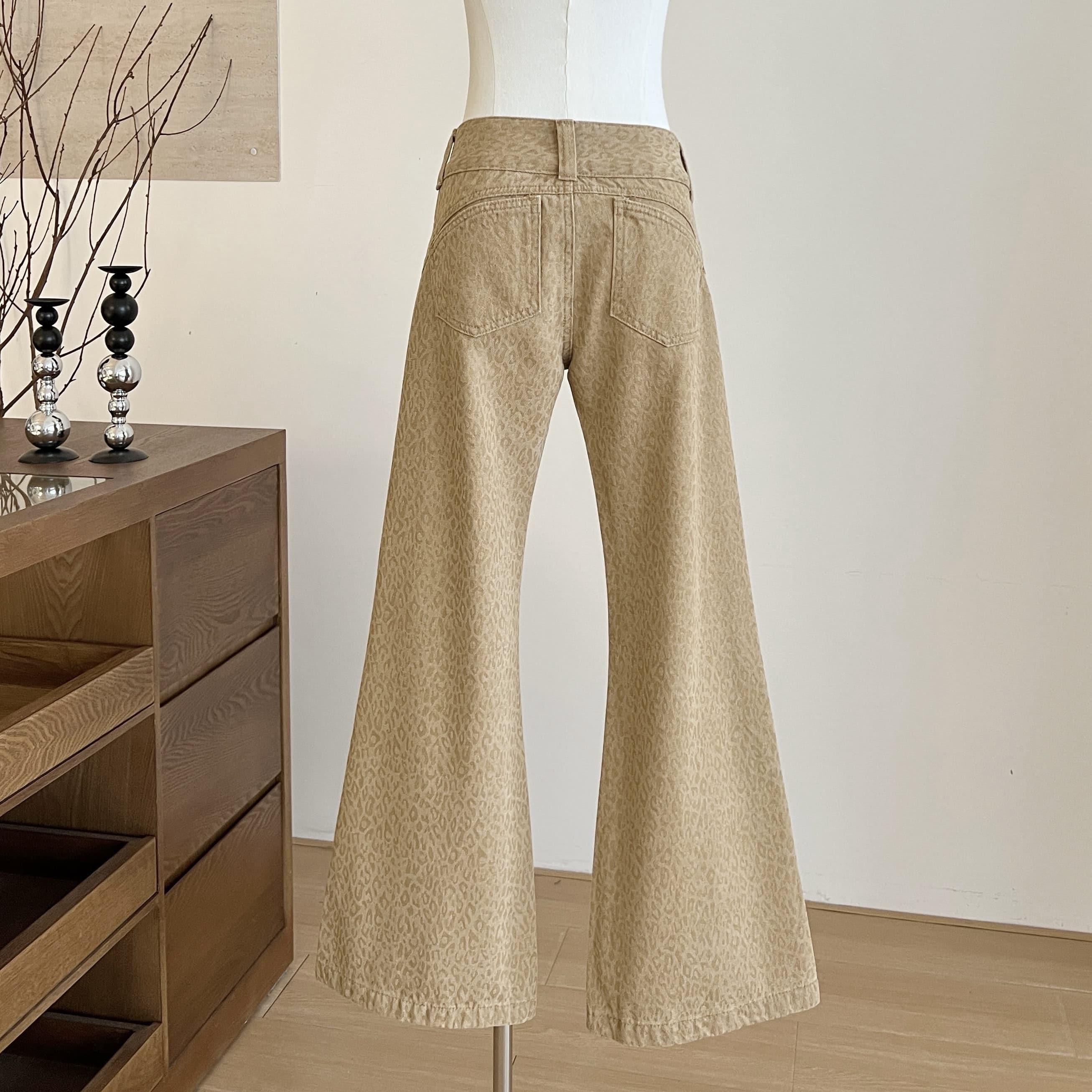 首頁所有商品/All Products下著/BOTTOM 時髦精低腰豹紋淺卡其微喇叭褲