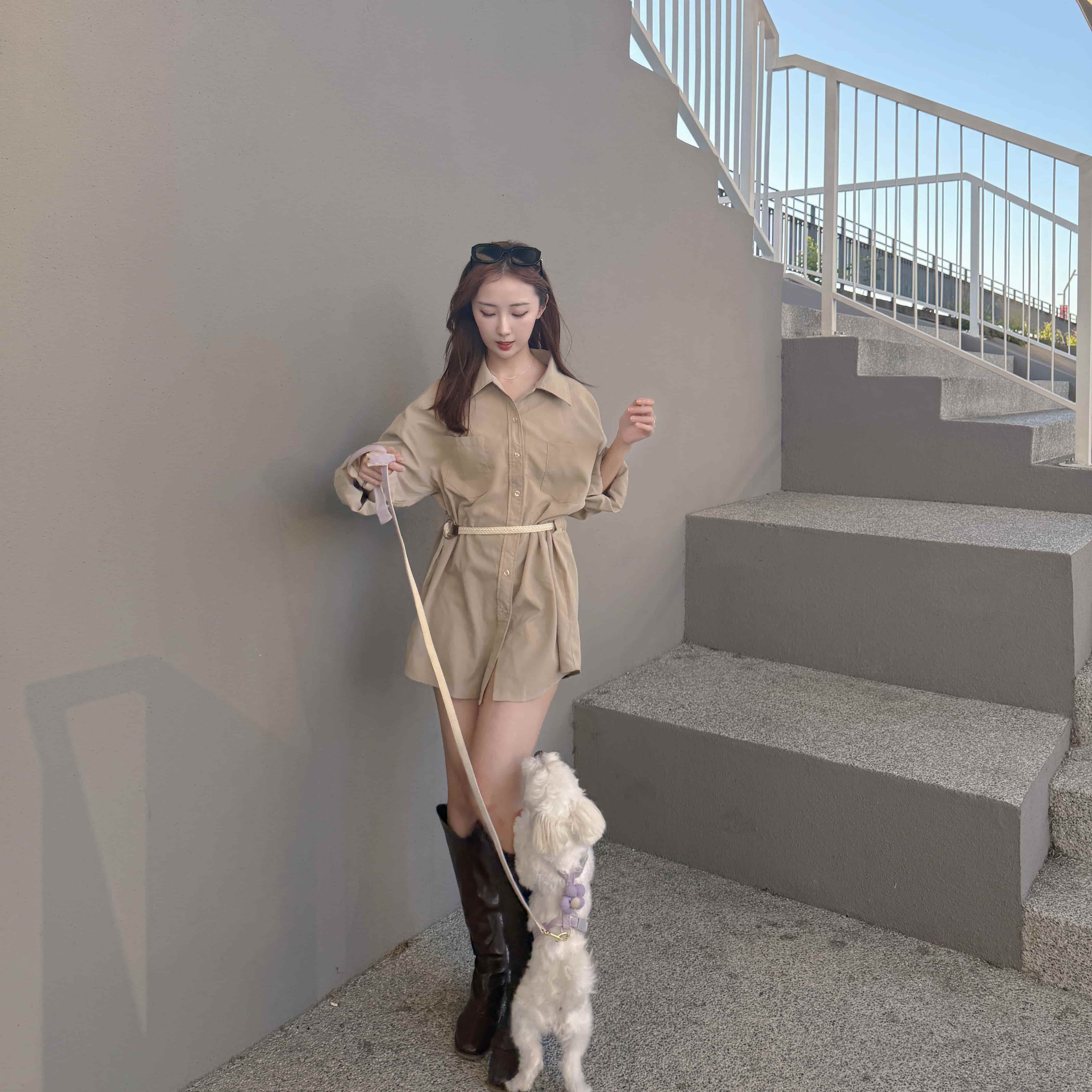 首頁所有商品/All Products洋裝/DRESS 歐美鬆弛感-時髦卡其襯衫洋裝