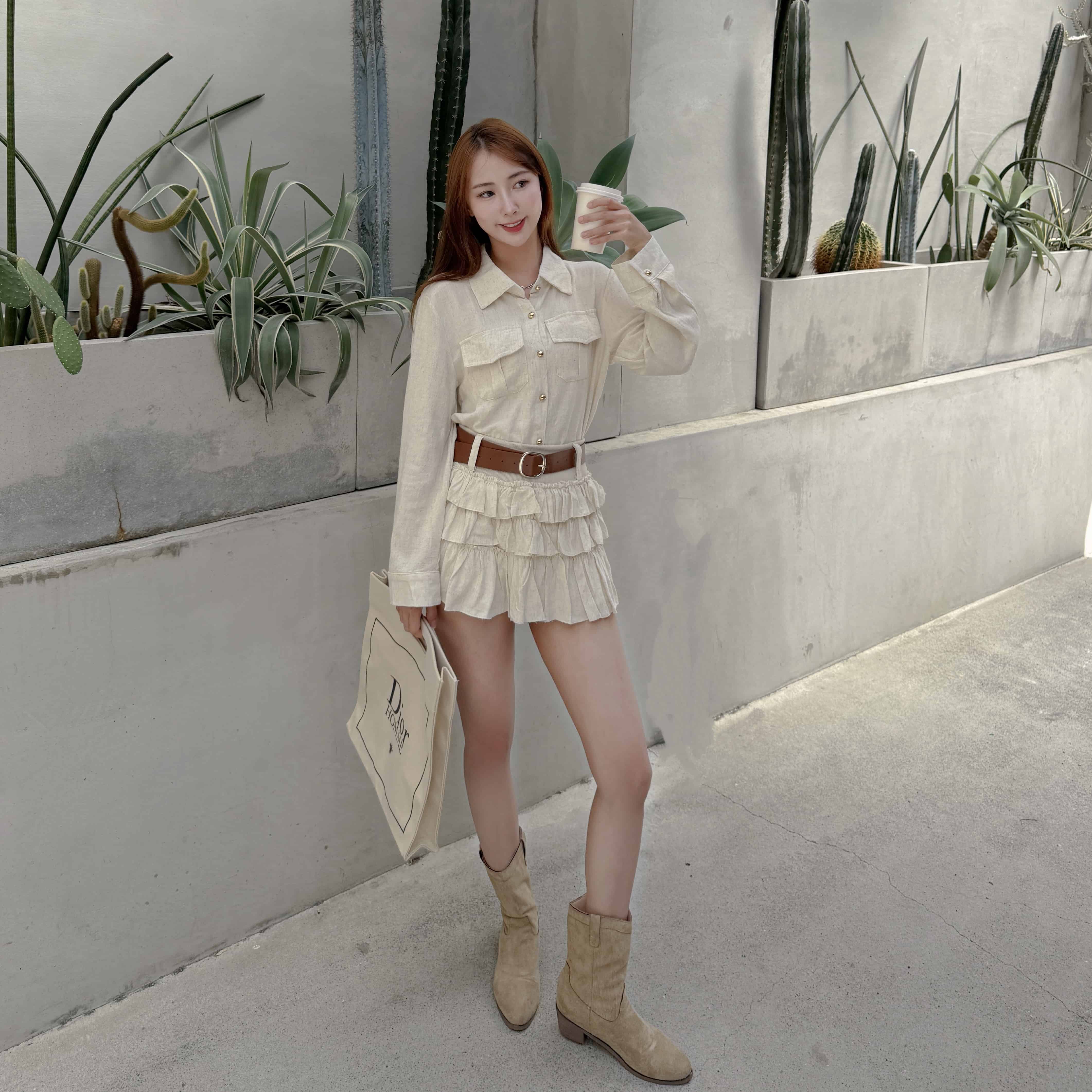 法式棉麻襯衫+蛋糕短裙套裝(附皮帶)
