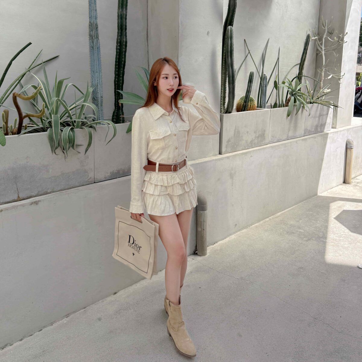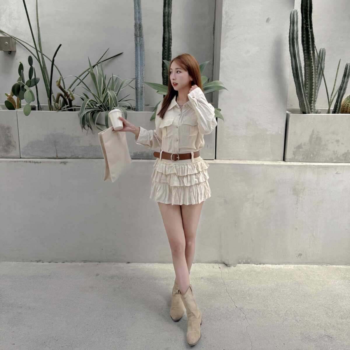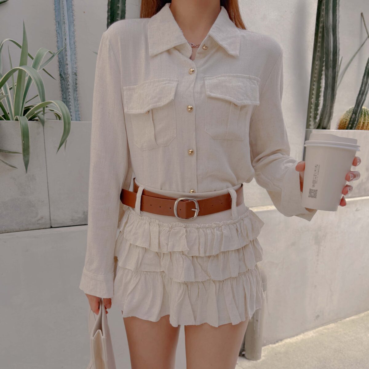 首頁所有商品/All Products套裝/SET 法式棉麻襯衫+蛋糕短裙套裝(附皮帶)