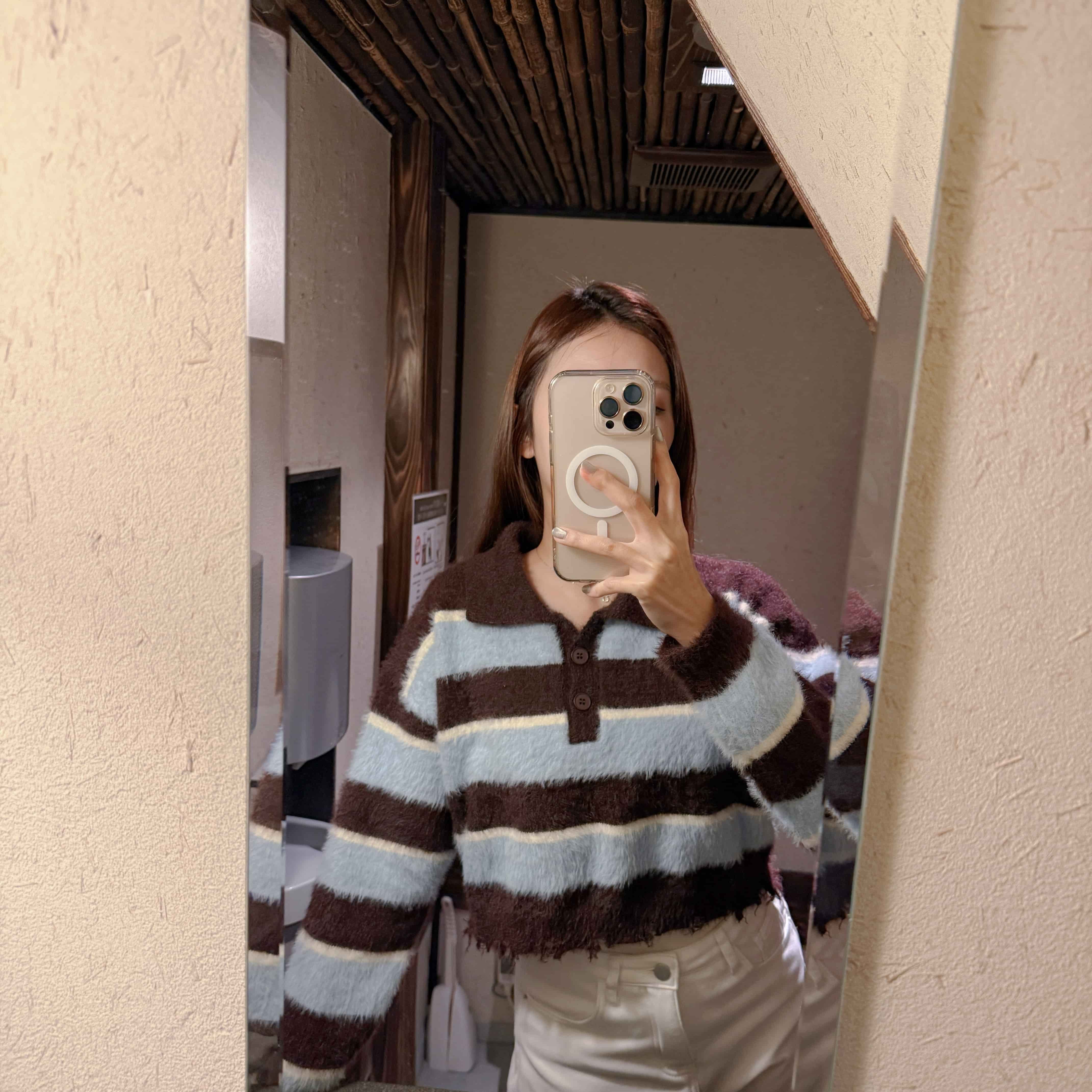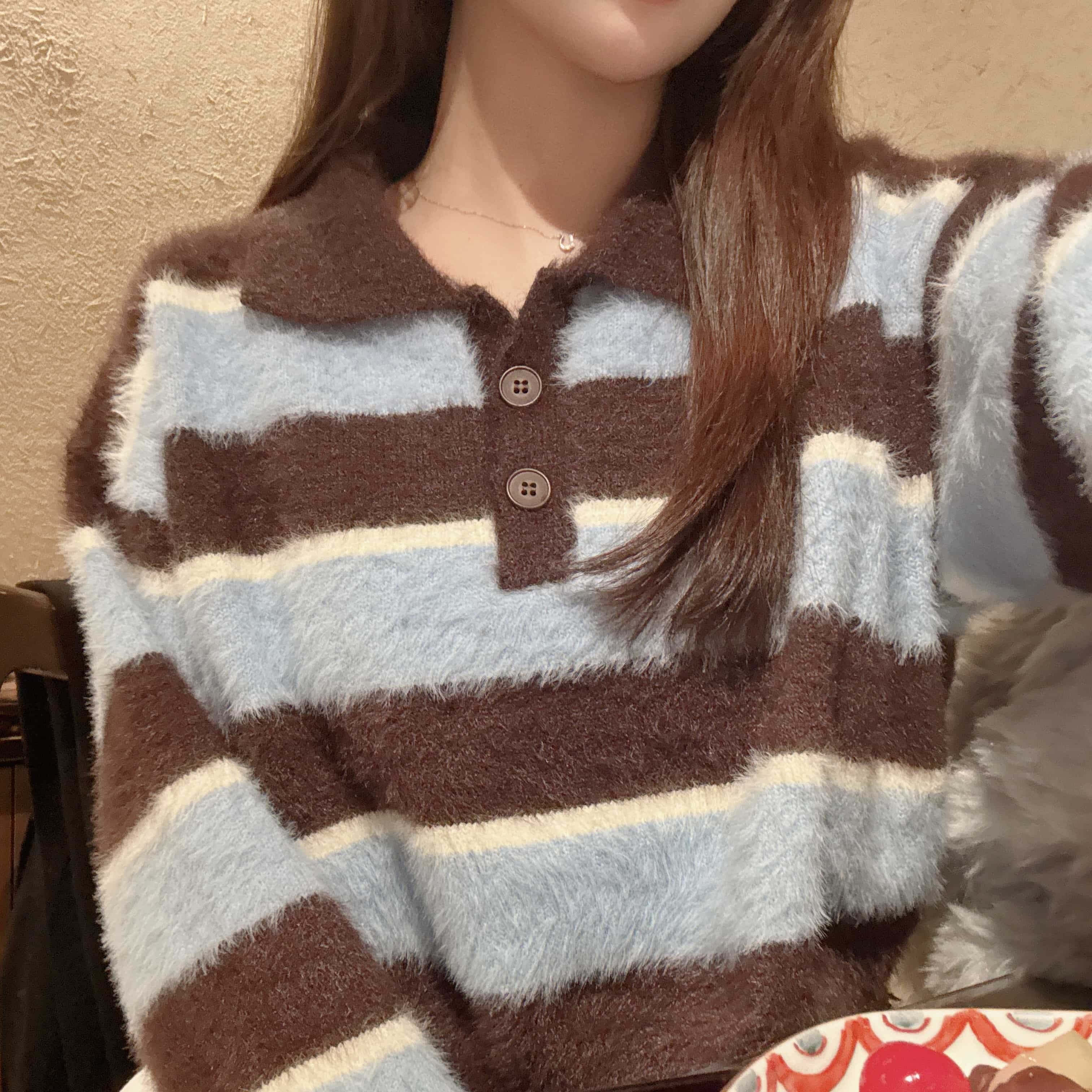 首頁所有商品/All Products上衣/TOP 海鹽可麗露-藍咖條紋水貂毛衣