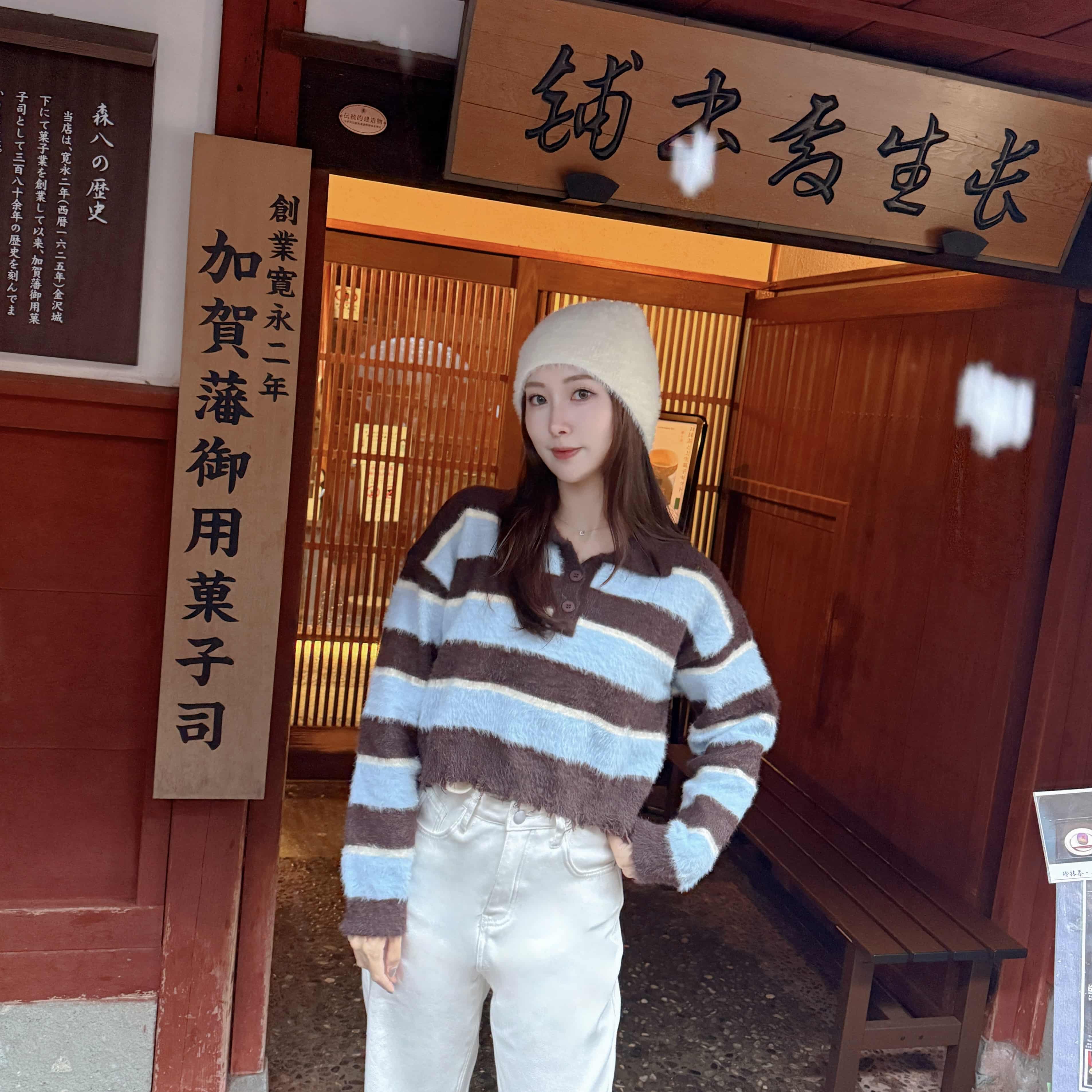 海鹽可麗露-藍咖條紋水貂毛衣