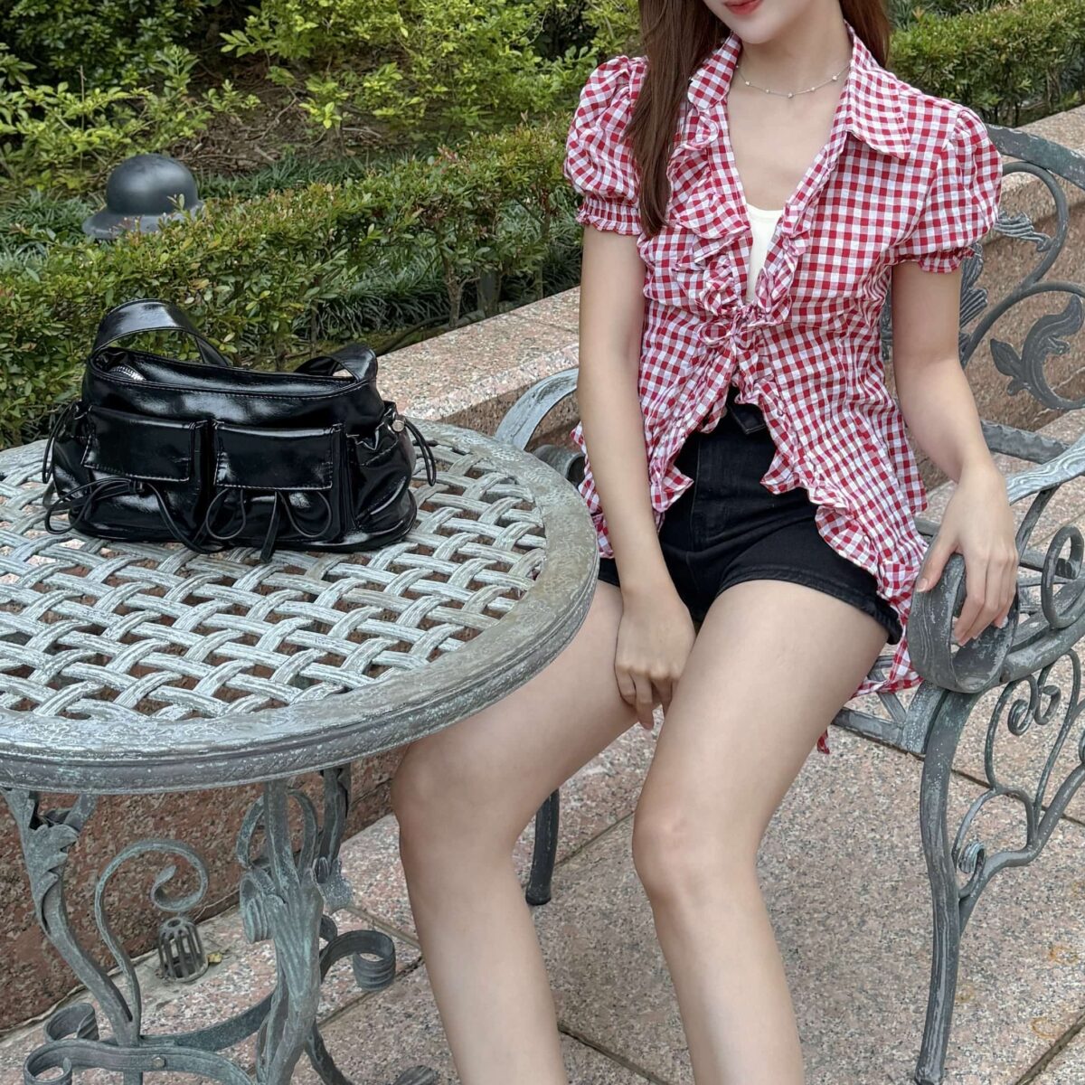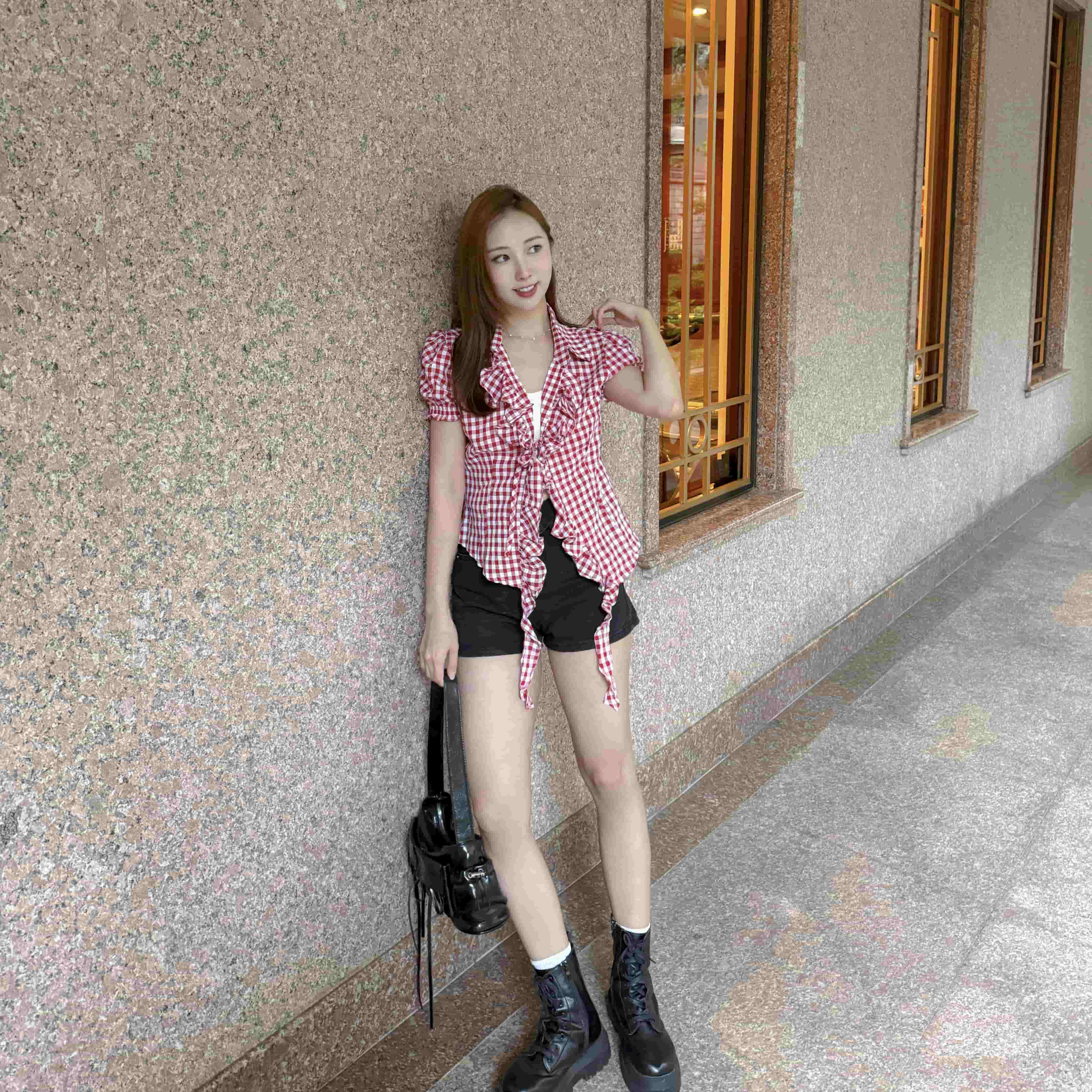 首頁所有商品/All Products上衣/TOP 甜辣格紋綁帶短袖襯衫