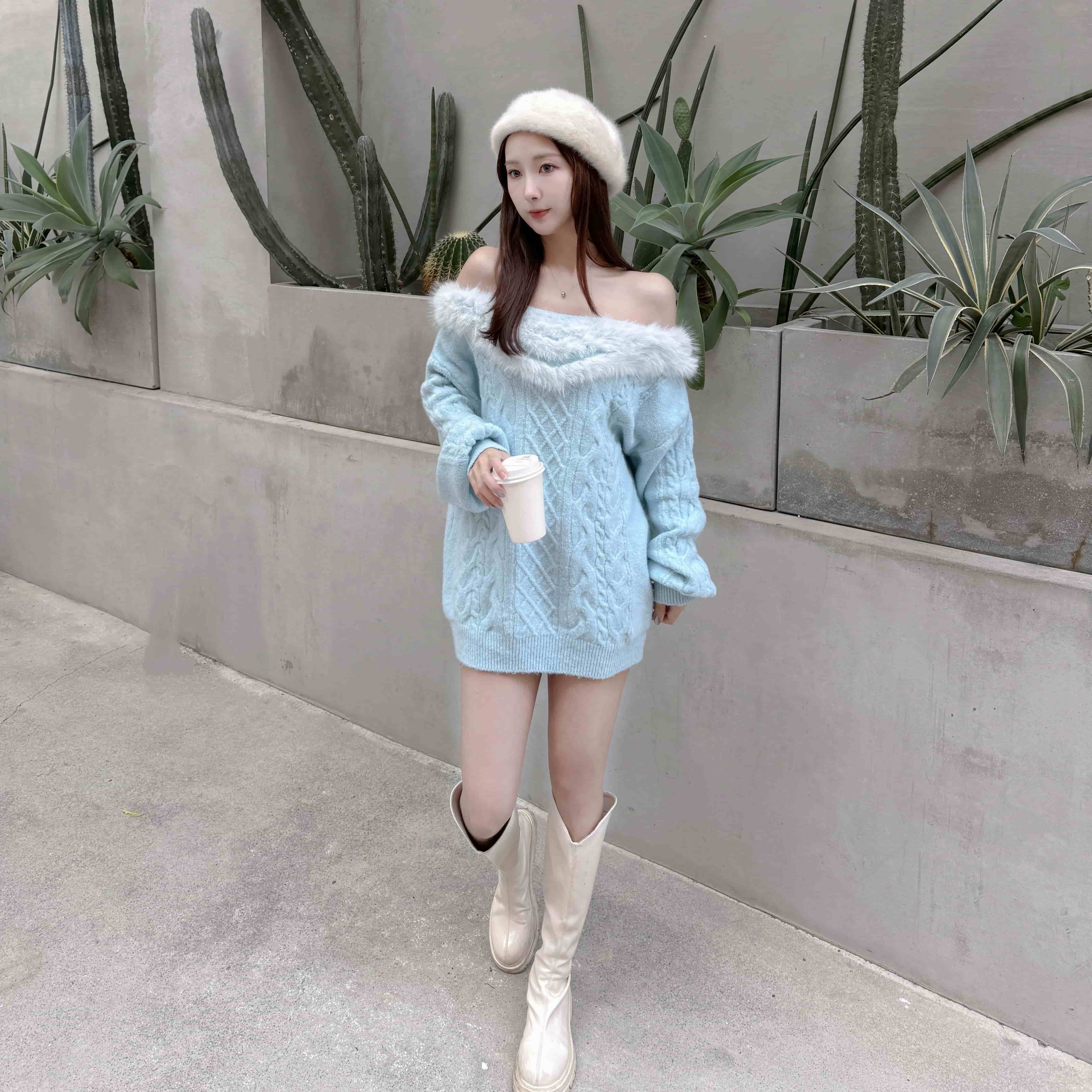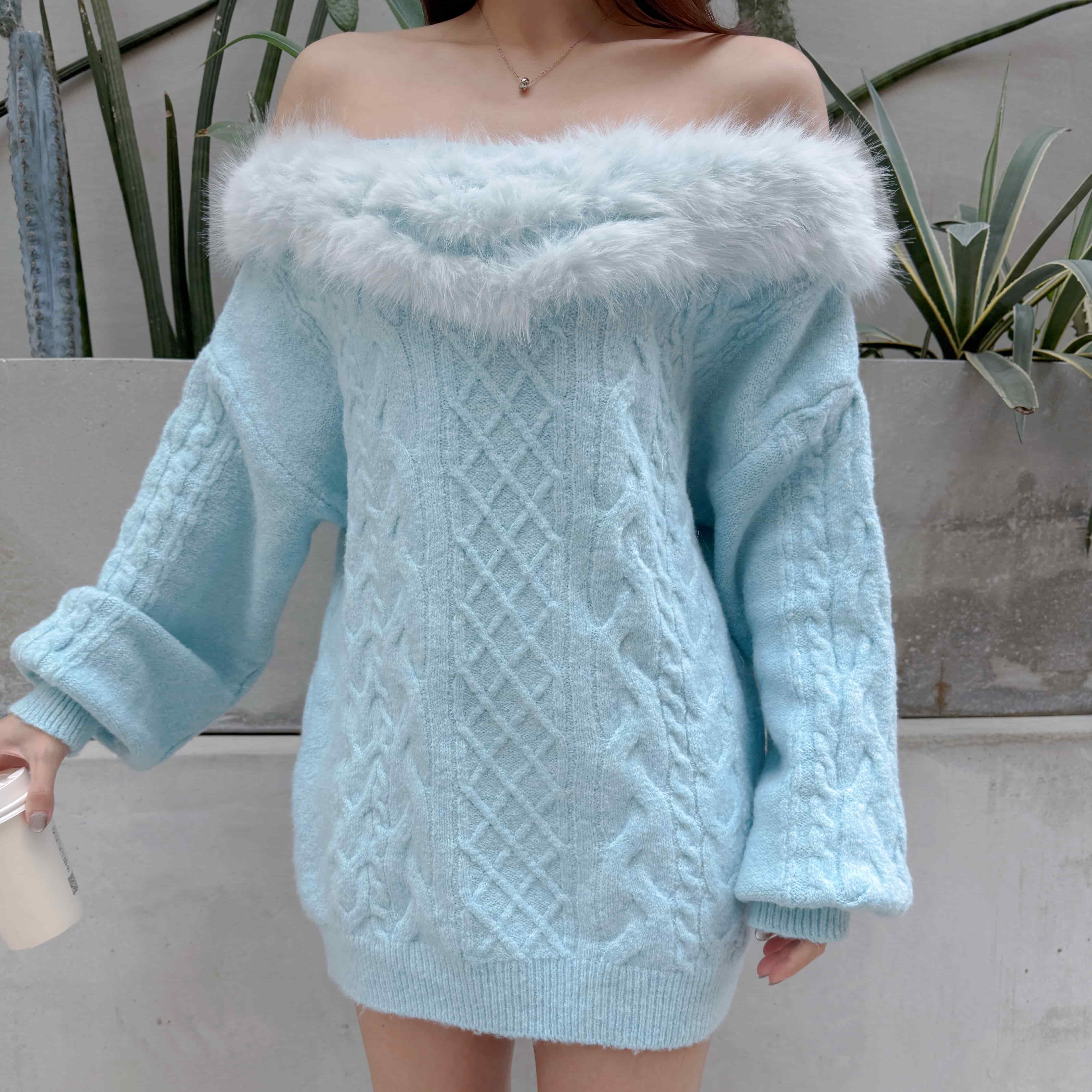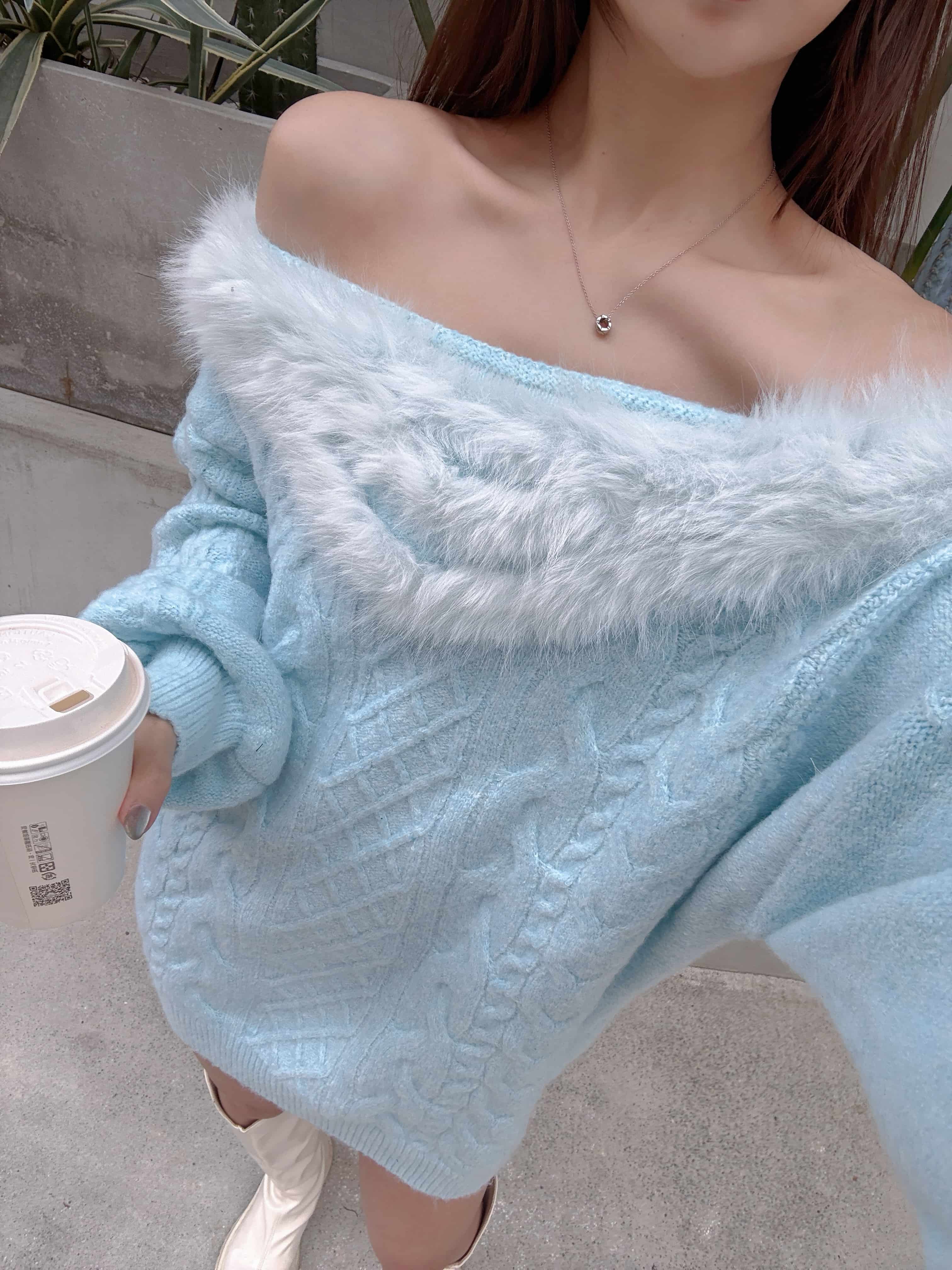 大V領拼接毛毛穿出一字領的小性感