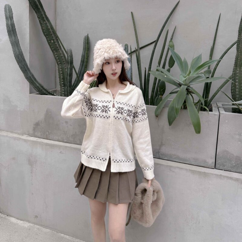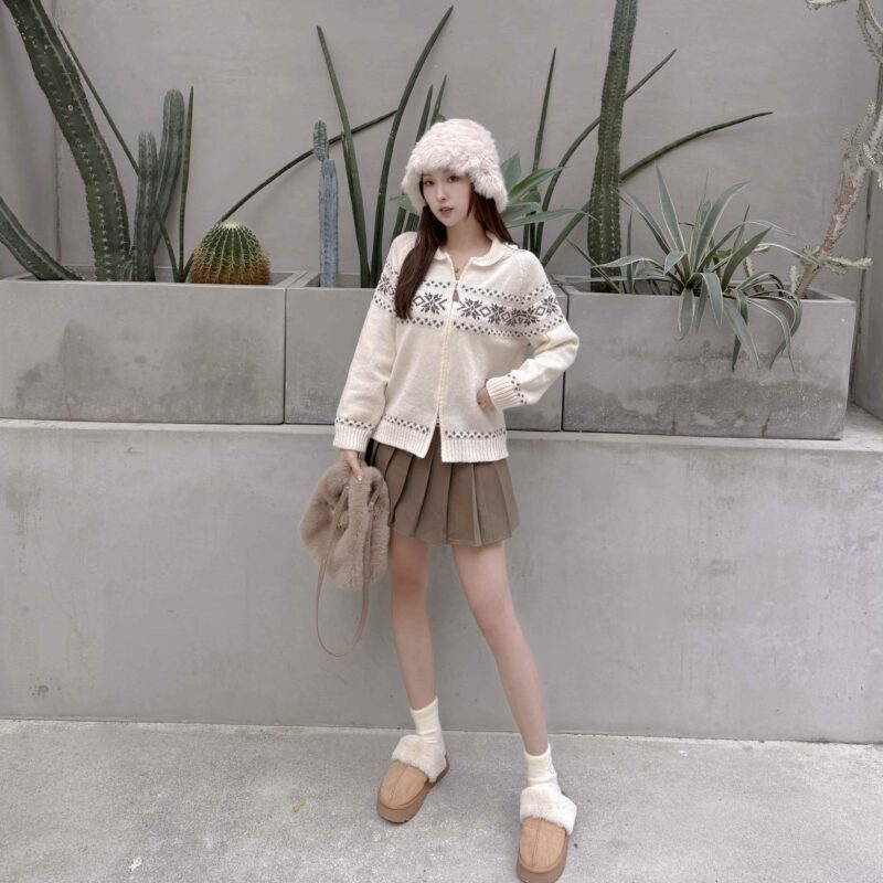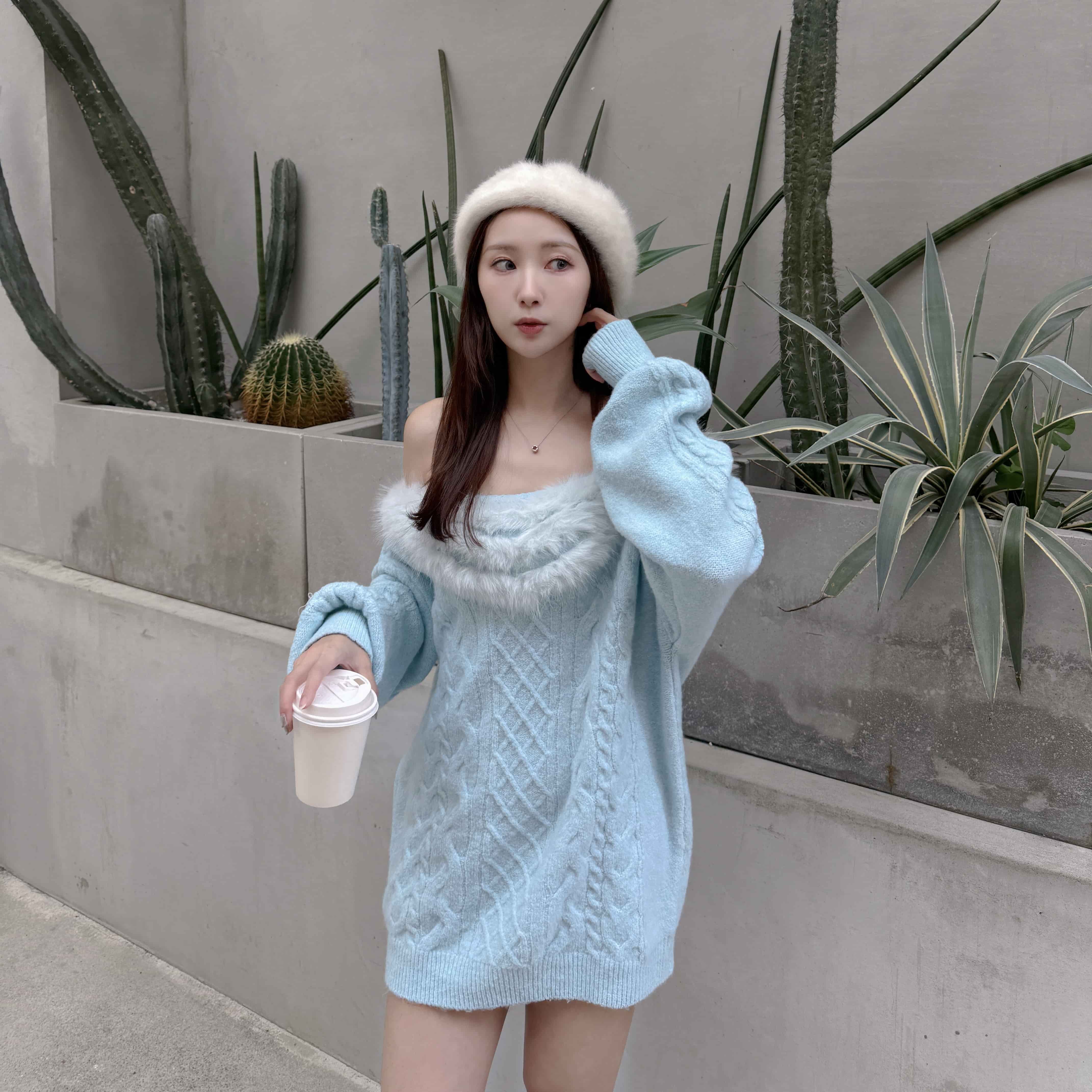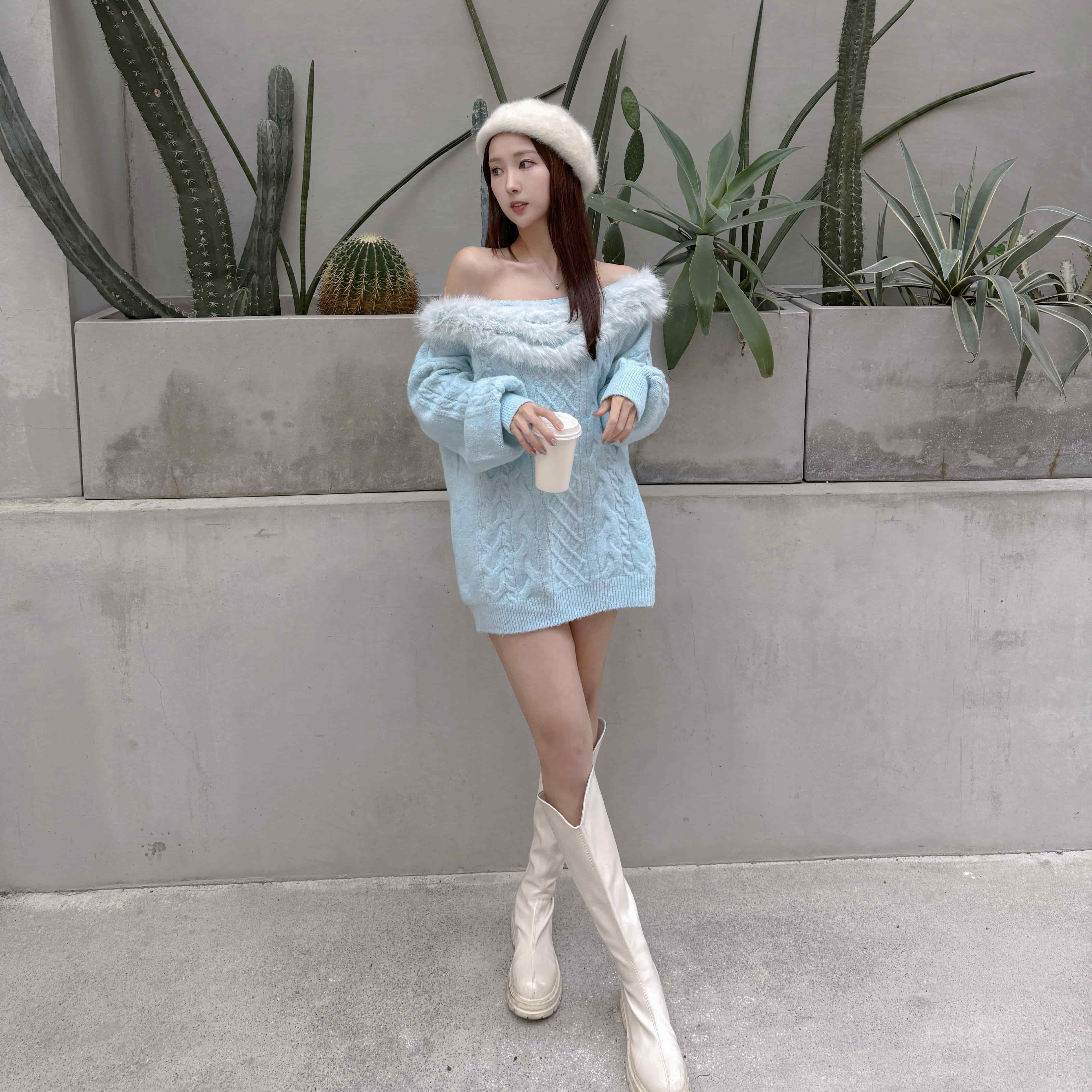 大V領拼接毛毛穿出一字領的小性感