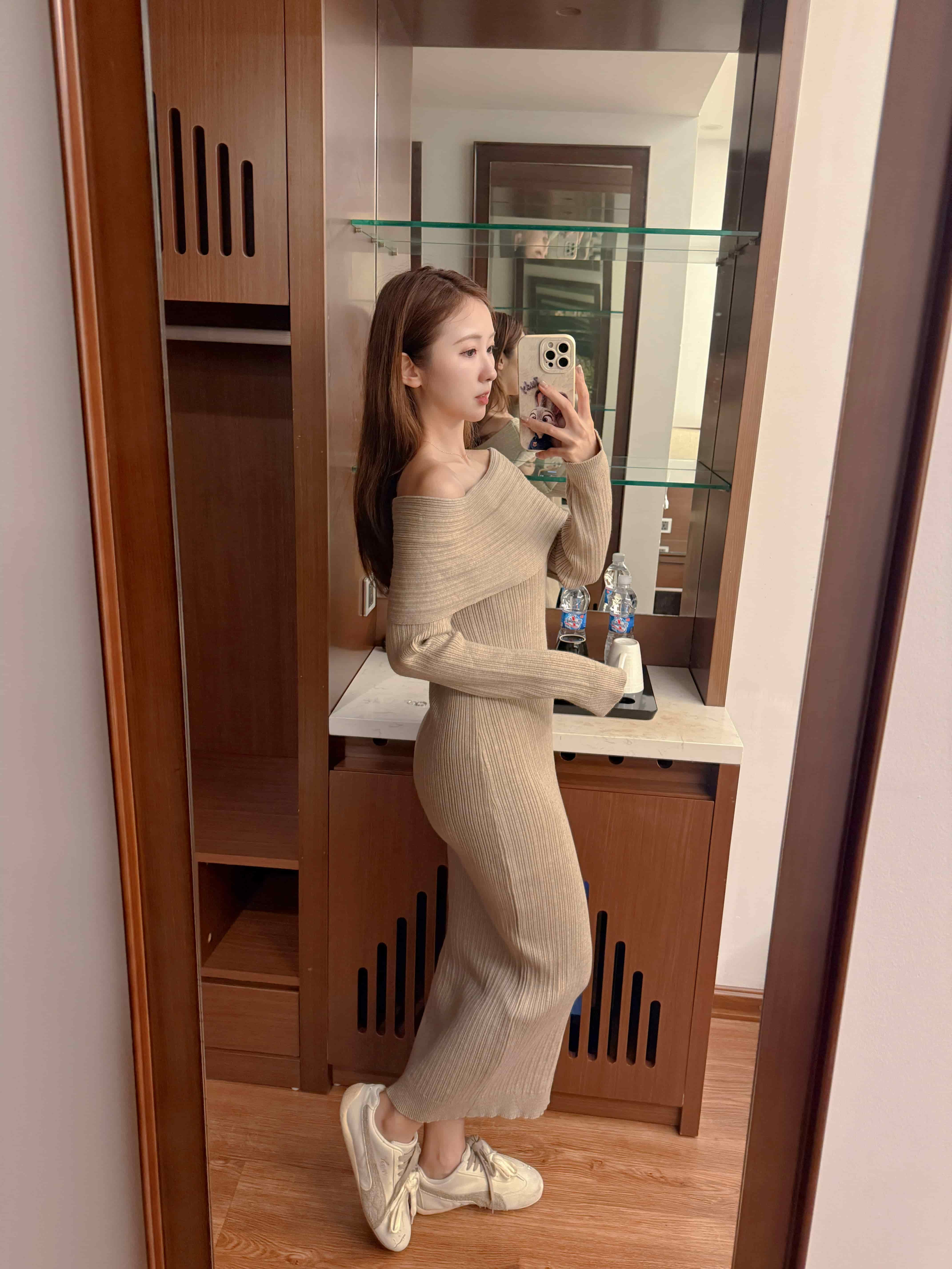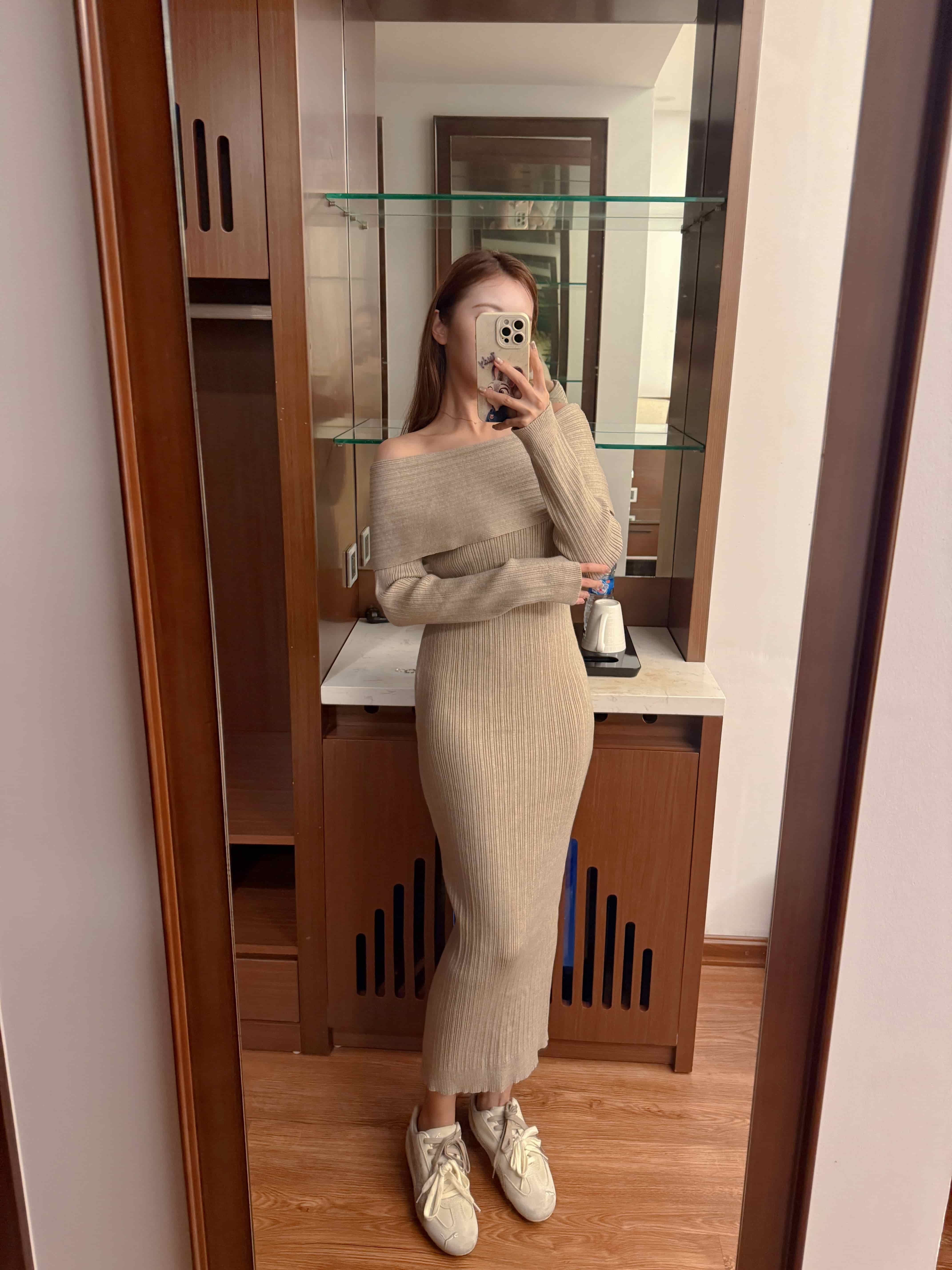 一字領翻領針織連身裙是高磅數的
